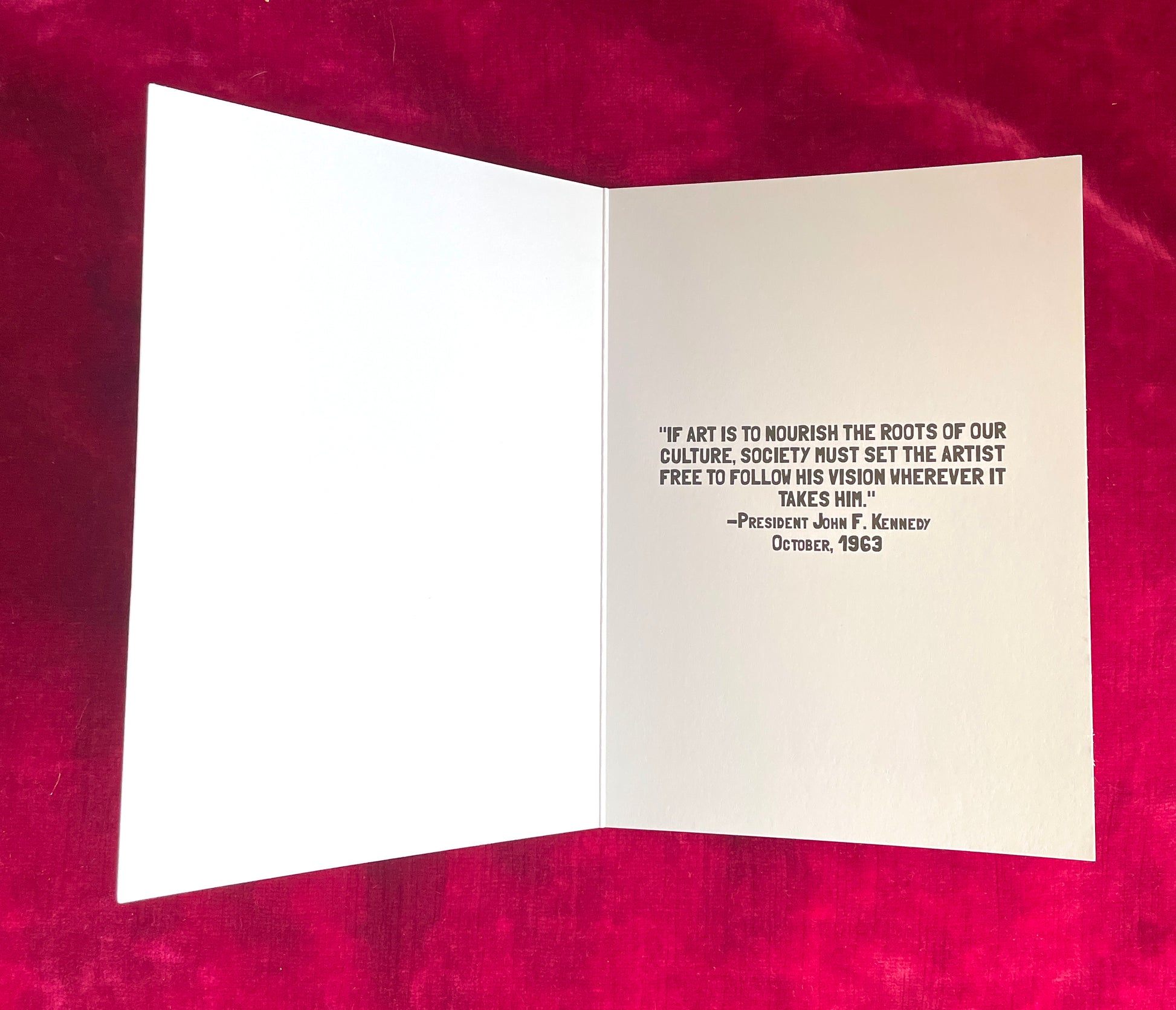 Inside Message: "IF ART IS TO NOURISH THE ROOTS OF OUR CULTURE, SOCIETY MUST SET THE ARTIST FREE TO FOLLOW HIS VISON WHEREVER IT TAKES HIM."- President John F. Kennedy, October, 1963